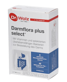 Darmflora plus select von Dr. Wolz enthält natürliche Inhaltsstoffe mit hoher Bioverfügbarkeit. Außerdem sind die Kapseln Lactose-, Gluten und Fructosefrei. Was uns an dem Produkt überzeugt hat waren die Zusammensetzung aus verschiedenen selektierten Milchsäurebakterien-Kulturen sowie Vitamine B6 und B12, welche auch ein gesundes Immunsystem unterstützen. Zusätzlich beinhaltet das Produkt Thiamin, Folsäure und Biotin.